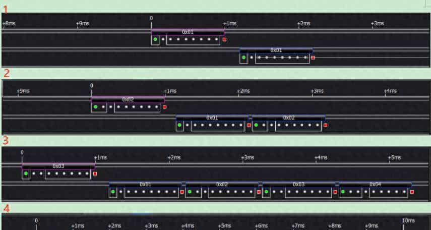 采用逻辑分析仪将4次收发数据全部抓出来,直观的做一下对比,如图11-1所示。